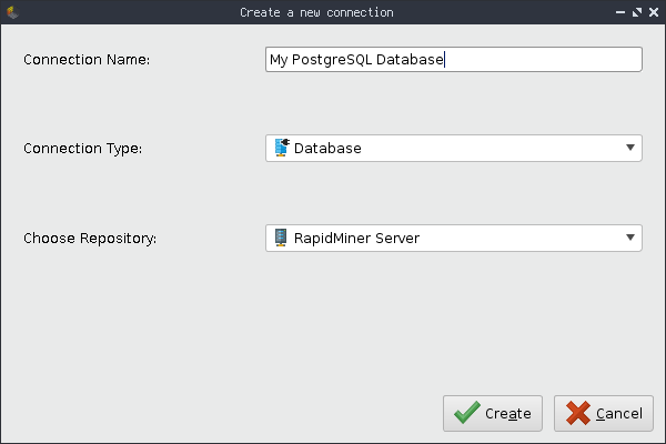 2. Define your connection: Add a name, select Database as type and the RapidMiner AI Hub repository as location for your connection.