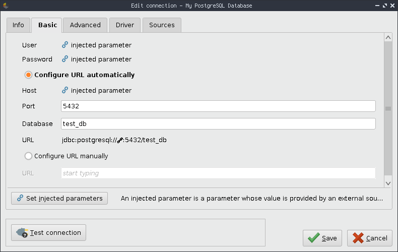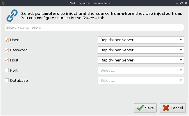 As pointed out above, we like to share this connection with other users on RapidMiner AI Hub. They should be able to use their own credentials and host. For this, we set user, password and host as injected by clicking on the Set injected parameters button in the Basic tab. Be sure to select RapidMiner AI Hub as source for the injected parameter. This will then use your RapidMiner AI Hub.