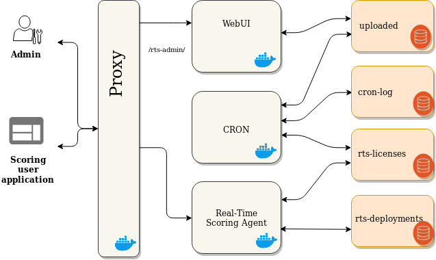 • For security considerations the docker-compose.yml file defines a dedicated docker network (rts-internal-network) for the RapidMiner Real-Time Scoring containers, so they can communicate with each other, but from the external network only the proxy container is available on the 80 and 443 ports. You can use this ports for scoring, and to reach the Web UI (eg. http://localhost, http://localhost/rts-admin/ https://localhost, https://localhost/rts-admin/ or any other IP address or domain name).