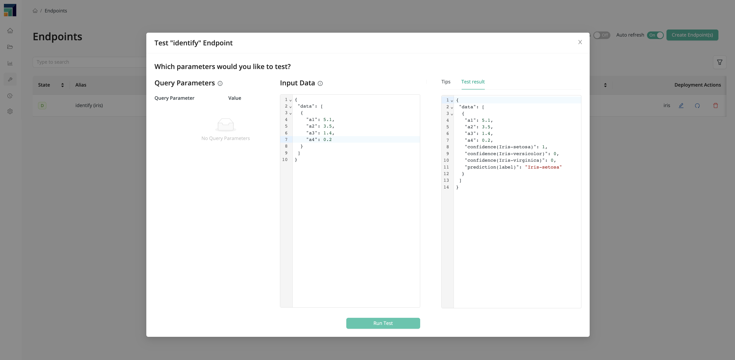 Within the Endpoints menu of RapidMiner AI Hub, under Endpoint Actions, click on Test to get a test page for your endpoint. Insert your JSON-formatted input data and click Run Test.