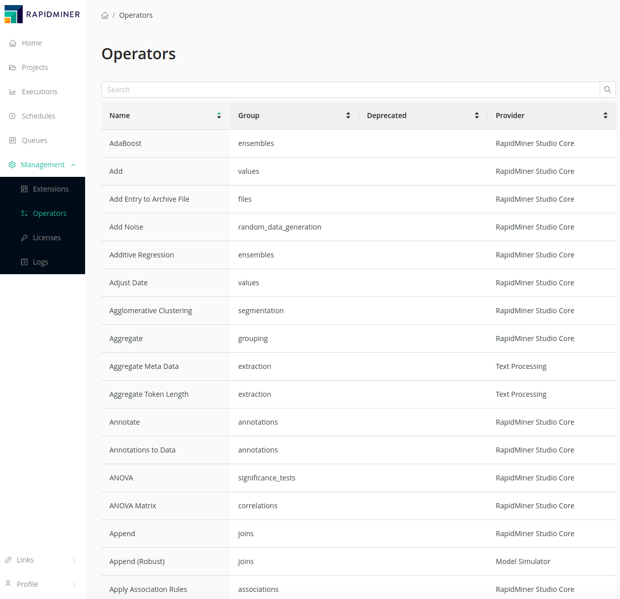 In addition, users of RapidMiner Server can view available Operators inside the Server's user interface when going to the Management -> Operators page.