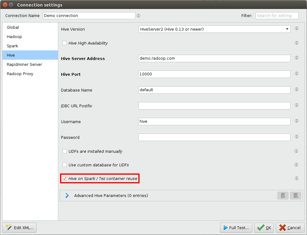 • Full Test Icon Full Test...: Runs a Full Integration Test on this connection. More information on the connection tests can be found in the Testing RapidMiner Radoop connections section.