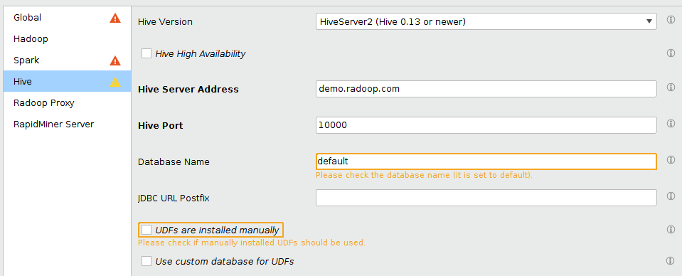 UDFs are installed manually Check this box if the Radoop UDFs are installed on the cluster manually. More information on the manual UDF installation can be found on the Operation and Maintenance page.