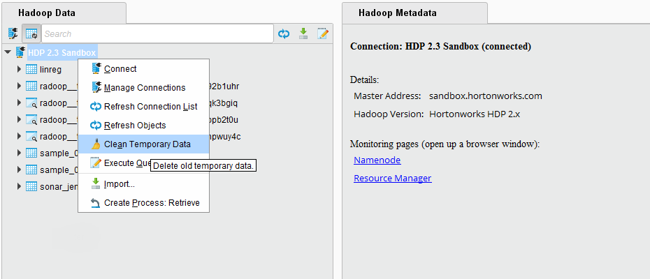 As an advanced analytics solution, RapidMiner Radoop is able to push very complex processes to Hadoop. It creates temporary objects (tables, views, directories, files) in Hadoop during process validation, process execution, during data import or full connection test. These objects are deleted automatically as soon as they are not needed anymore. Namely, once a process or an import job or a full connection test completes or fails, all related objects are deleted.