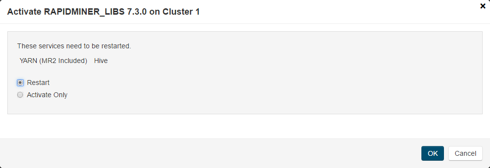 8. If the activate dialog does not display service restart options, you have restart Yarn and Hive services manually.