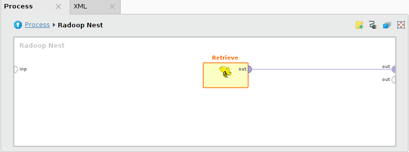 A process accesses data that already resides on the cluster in a Hive table using the Retrieve operator. Retrieve only loads references and metadata into memory; the data remains on the cluster to be processed with further operators. Connect the output port of Retrieve directly to the Radoop Nest output to fetch the data sample from memory.