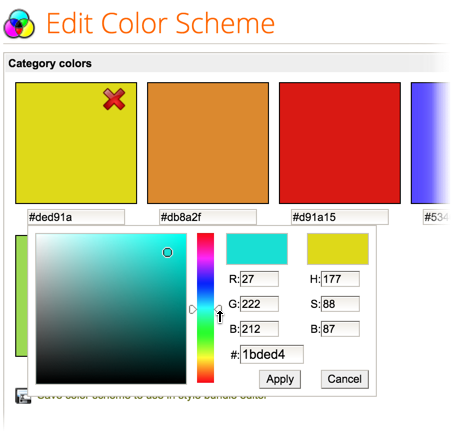 Color schemes can be used as part of a defined style bundle by selecting custom color. They are applied from the Edit Style Bundle page. There are two methods for doing this.