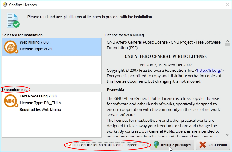 3. When the download completes, the Confirm Licenses window opens. This window lists any dependencies for your selected extension and allows you to install all necessary components. Accept the terms of the license agreement and click Install Install Packages.